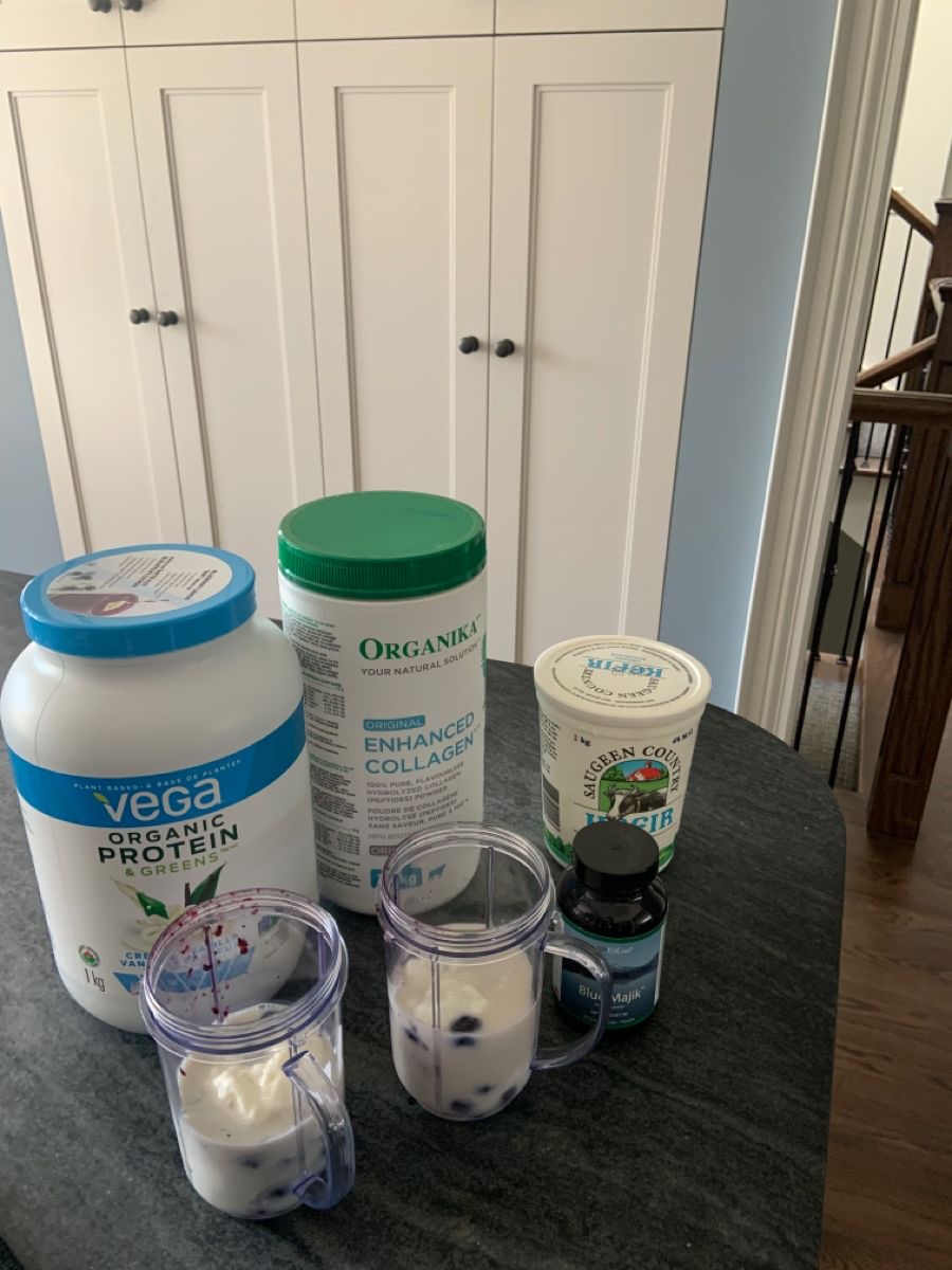 ~1/2 cup frozen blueberries (a strong antioxidant and great for memory retention) ~1/2 banana (potassium and essential for getting a creamy consistency) ~2 tablespoons plain plant-based yoghurt (I use Presidents Choice non-dairy) or Kefir (I use Kefir a few times a week as it’s a great natural probiotic) ~1 tablespoon Collagen Powder of your choice (to support hair, skin, and nail health) ~1 tablespoon of VEGA Vanilla Protein Powder (or a vegan vanilla protein powder of your choice) ~1 teaspoon of Blue Majik Powder (optional, an algae that is an additional antioxidant, supports healthy joints and produces a super bright blue color) ~1 cup almond milk